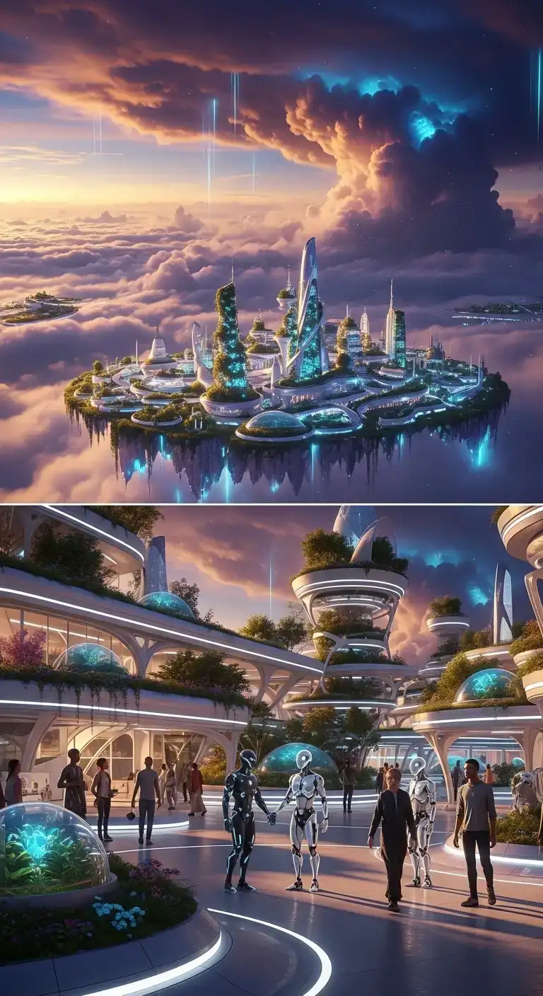 "Create a visually stunning and emotionally captivating video (2 minutes long, 4K resolution, 60 FPS) paired with a single high-resolution still image (8K, photorealistic) that together tell a cohesive, awe-inspiring story. The theme is 'The Dawn of a New Era,' depicting a futuristic utopian city floating among vibrant, bioluminescent clouds in a twilight sky. The city blends sleek, organic architecture with glowing, eco-friendly technology, inhabited by diverse, harmonious human and AI beings working together. Video Details: - Style: Cinematic, with a mix of Studio Ghibli-inspired whimsy and Blade Runner's futuristic grit, rendered in a hyper-realistic yet slightly dreamlike aesthetic. - Scene Composition: Begin with a sweeping aerial view of the city emerging from golden and violet clouds, with soft light rays piercing through. Transition to vibrant street-level scenes showing collaboration between humans and AI (e.g., a human artist and AI co-creating a holographic sculpture). Include dynamic camera movements (smooth pans, zooms, and slow-motion sequences) to highlight intricate details like glowing flora, reflective surfaces, and bustling yet serene city life. - Lighting and Color Palette: Warm golds, deep purples, and neon blues, with bioluminescent accents. Ensure a balance of vivid and soft tones to evoke wonder and hope. - Soundtrack: A soaring orchestral score with futuristic synth undertones, building to an emotional crescendo. Include subtle ambient sounds (e.g., soft hums of technology, distant laughter, wind through clouds). - Mood and Tone: Inspirational, hopeful, and slightly mystical, evoking a sense of unity and limitless possibilities.