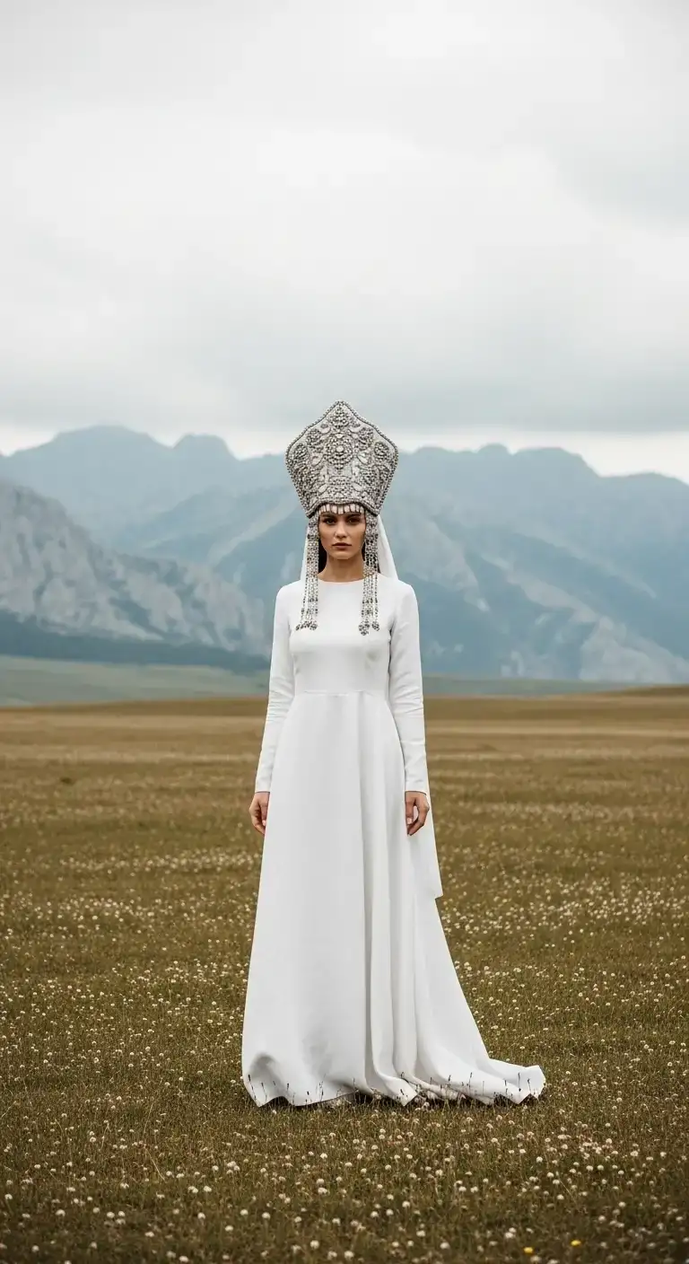 通用A woman in traditional attire with a flowing white dress and a large, ornate hat. An open field with distant mountains under an overcast sky. Predominantly white and blue hues with soft lighting. Photorealistic digital art.