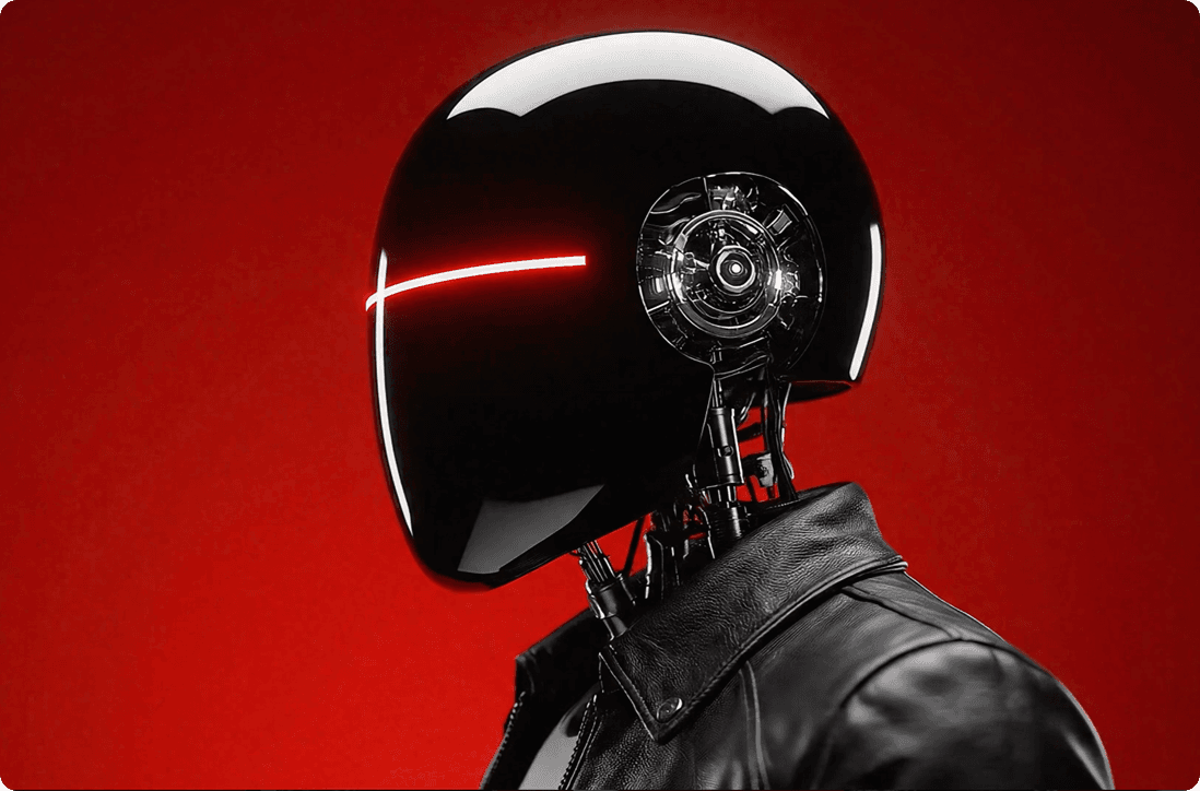 Watch your pictures come alive with cinematic motion and emotion, as if time itself awakens them.An image features a side view of a futuristic, humanoid robot or cyborg set against a bold red background. The figure wears a sleek, black, glossy helmet with a single red LED line running horizontally across its visor, evoking a minimal yet intimidating aesthetic. Intricate mechanical details are visible near the ears, suggesting advanced audio or communication technology. The body is clad in a luxurious black leather jacket, blending cyberpunk style with tactical functionality. Exposed metallic components at the neck hint at its robotic nature. The overall design feels futuristic, stylish, and stealthy — a perfect fusion of fashion, technology, and science fiction.
